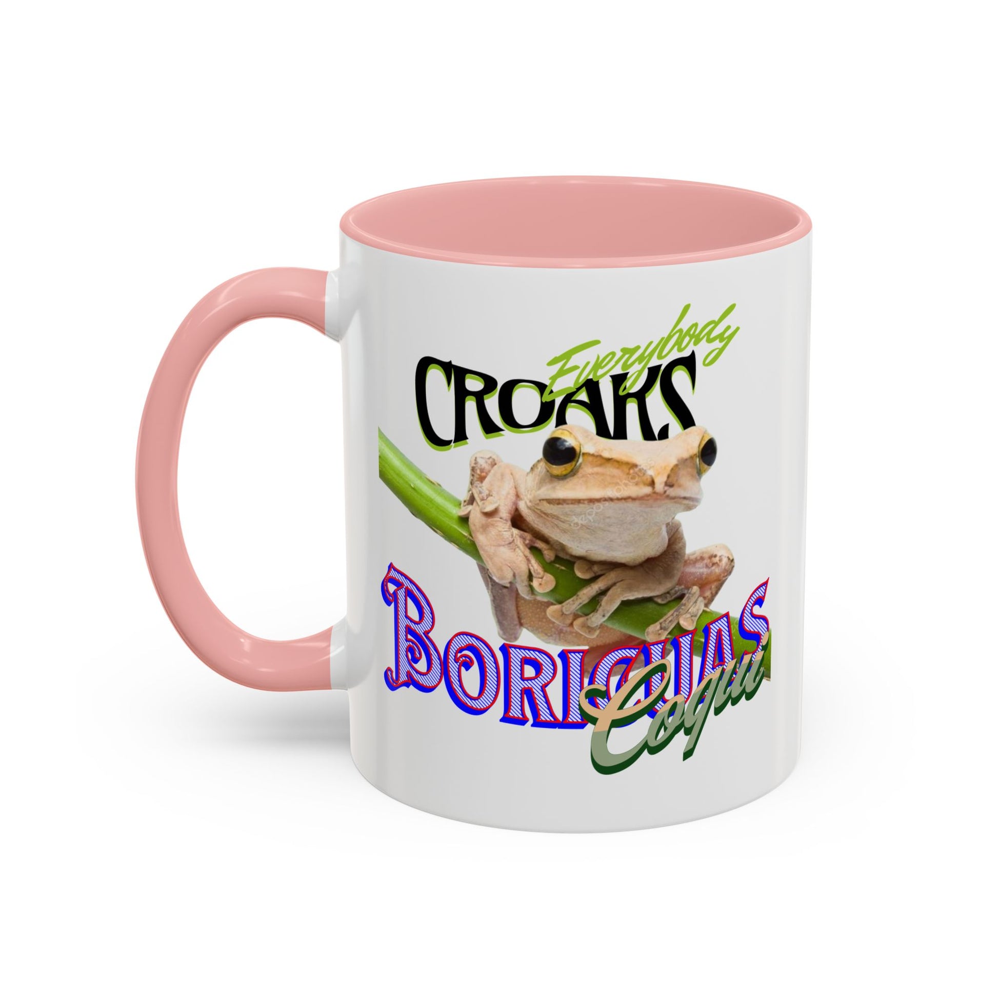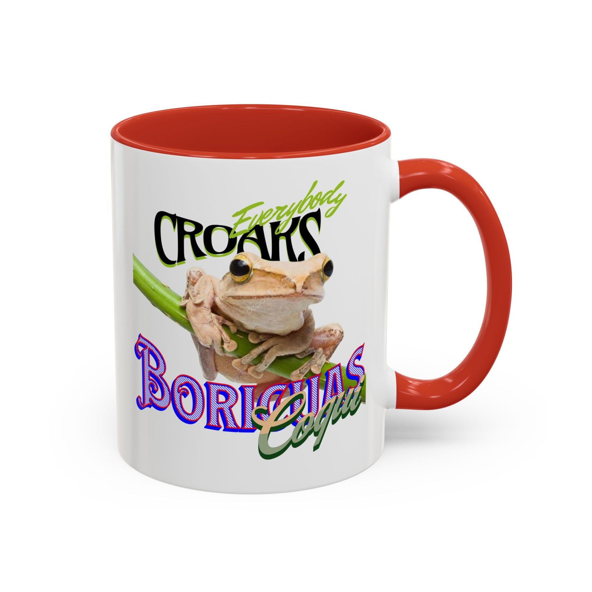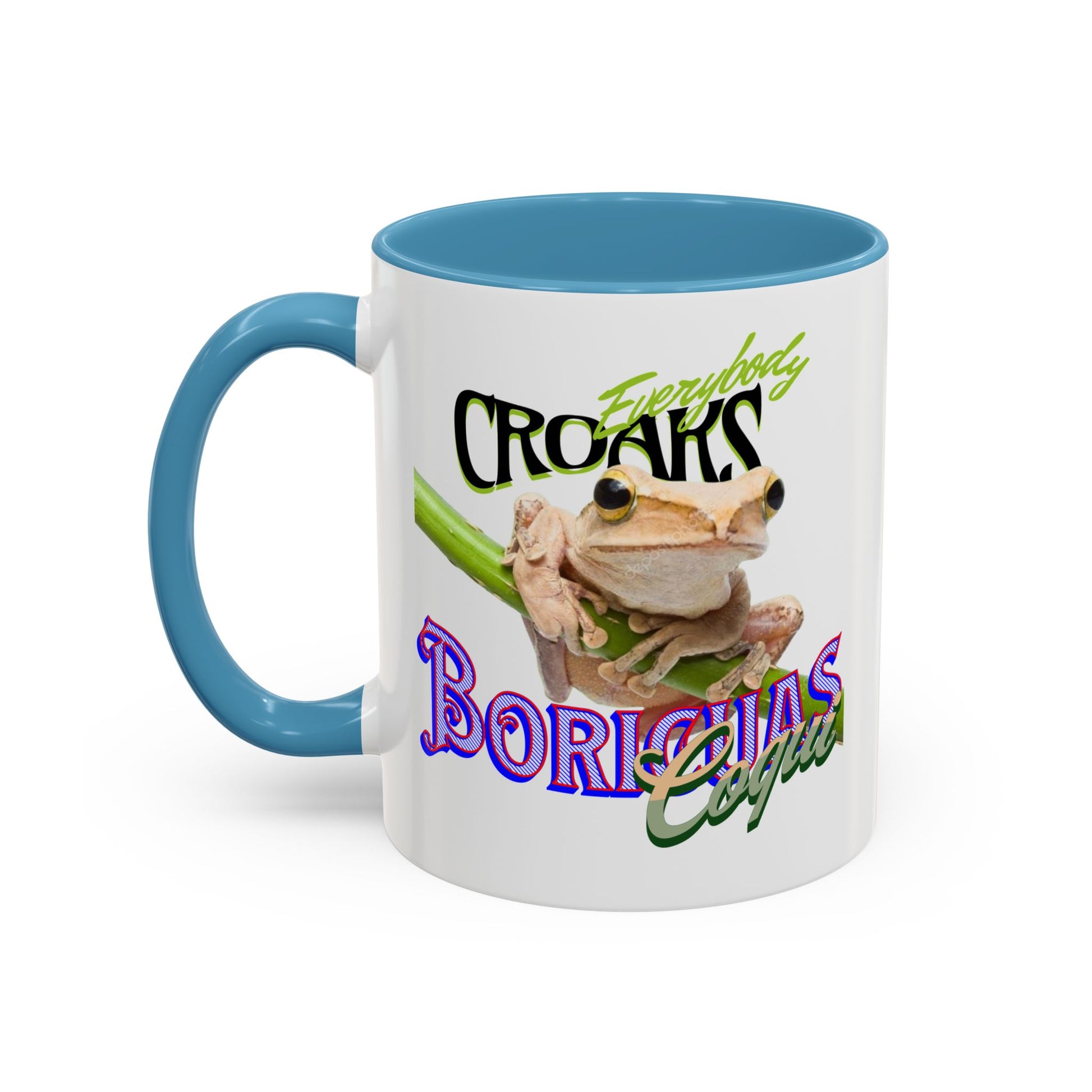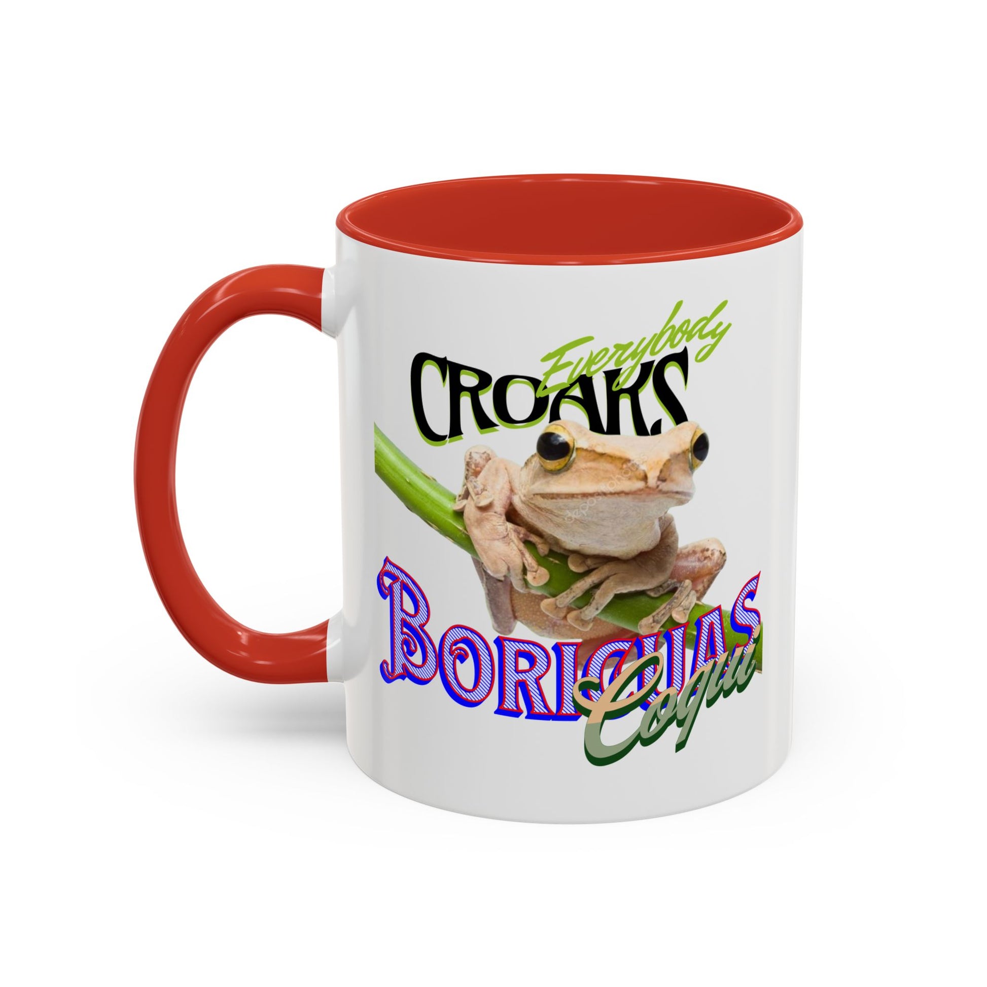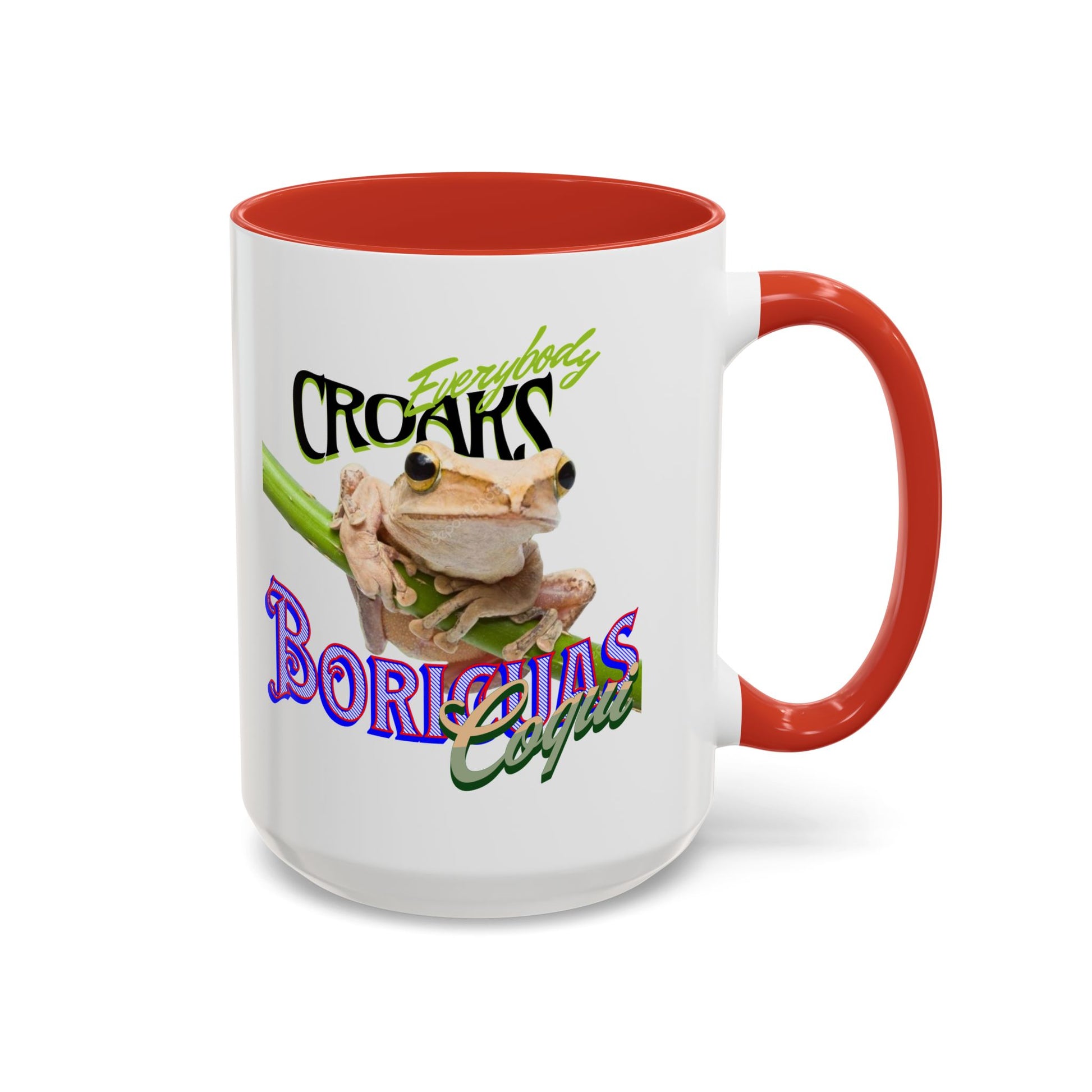 This vibrant ceramic mug celebrates the iconic Coquí, a beloved symbol of Puerto Rico, playfully blending the sound of the Coquí frog as a nod to Puerto Rican pride. If el canto del* coqui calls to your soul you'll appreciate this mug. The text on the mug reads, "Everybody Croaks Boricuas Coqui" and features a charming image of the Coquí, a tiny but powerful frog known for its distinctive "co-kee" call that fills the Puerto Rican landscape at night.
