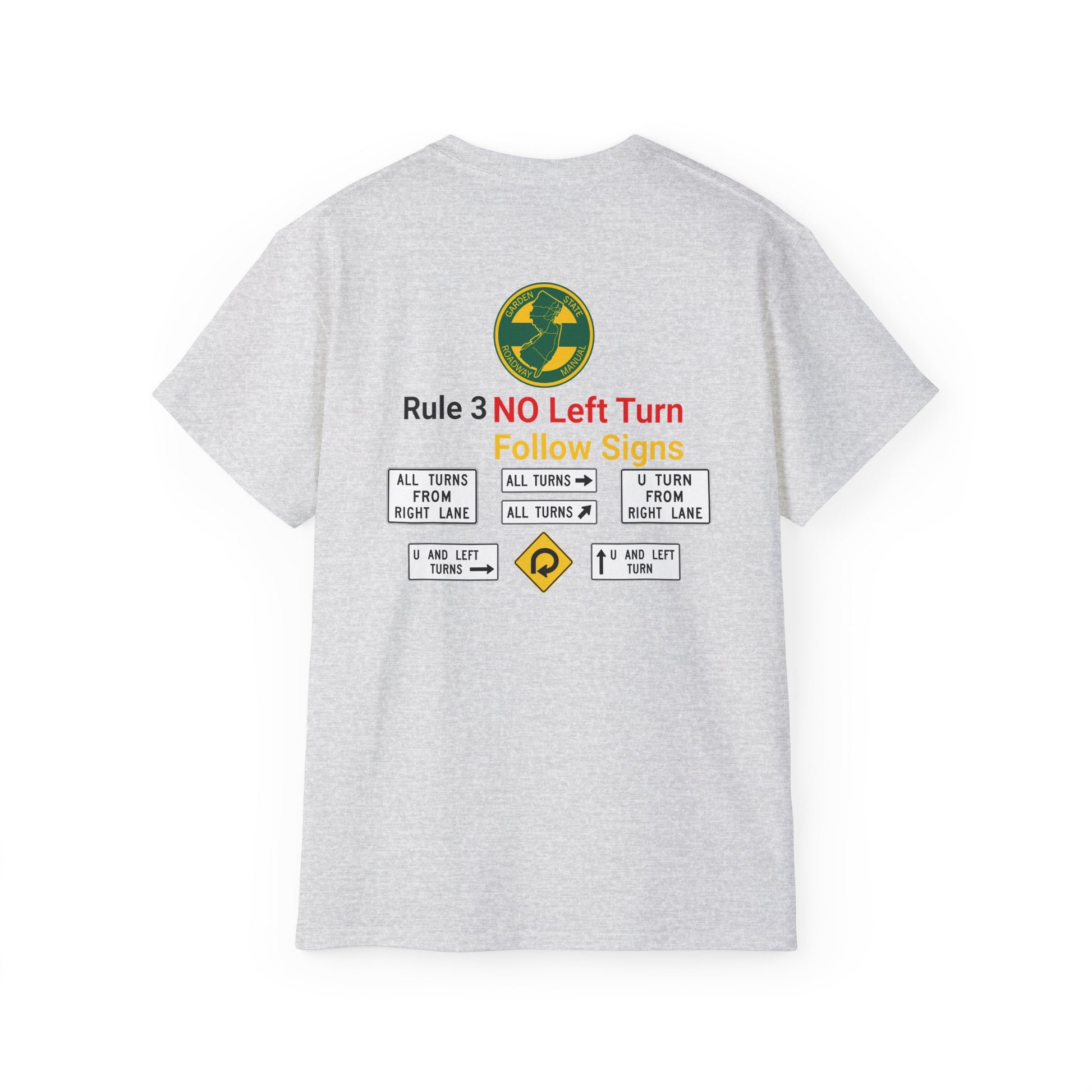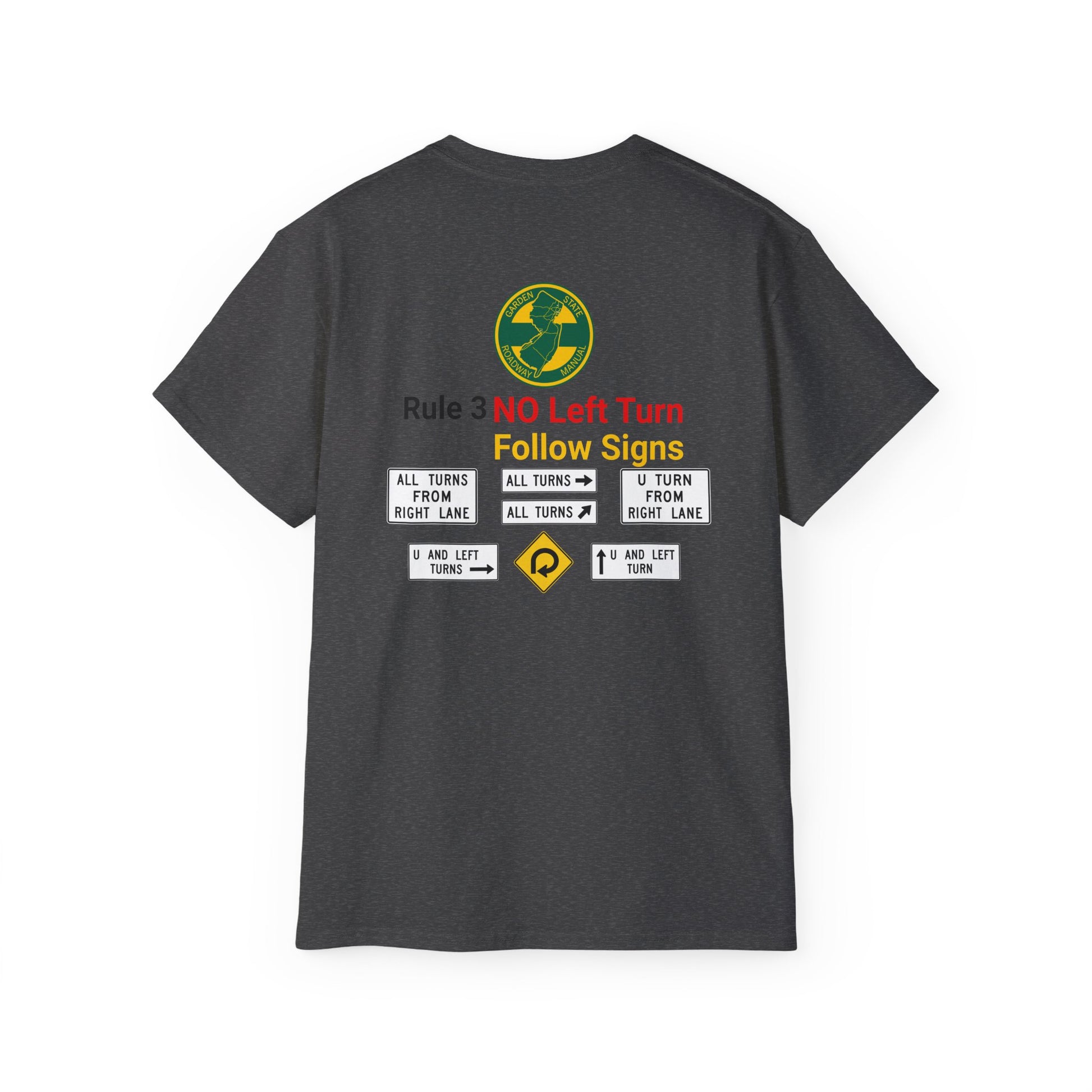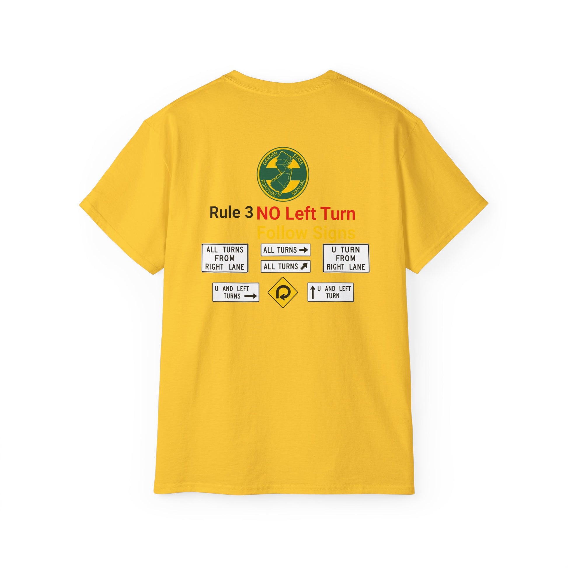 A snarky nod to New Jersey's unique driving atmosphere. Featuring the instantly recognizable yellow and green Garden State Parkway colors. Highlighting an atypical element of driving in New Jersey, the unmistakable "No Left Turn" which seem to exist at virtually every other intersection. A must-have for anyone who’s spent time on NJ’s roads.