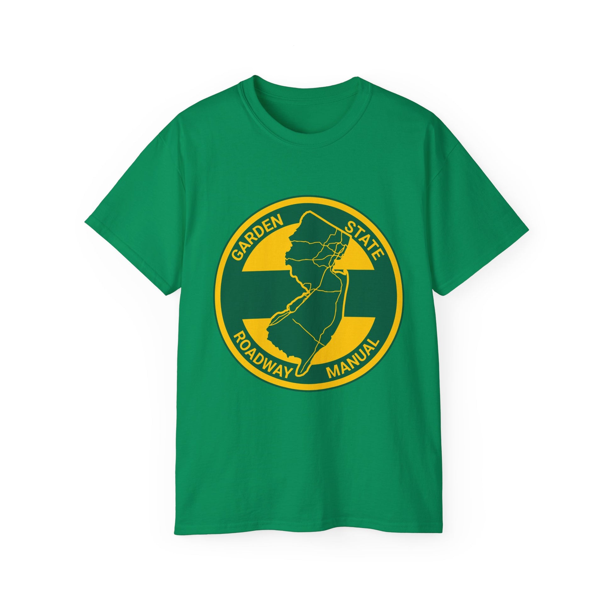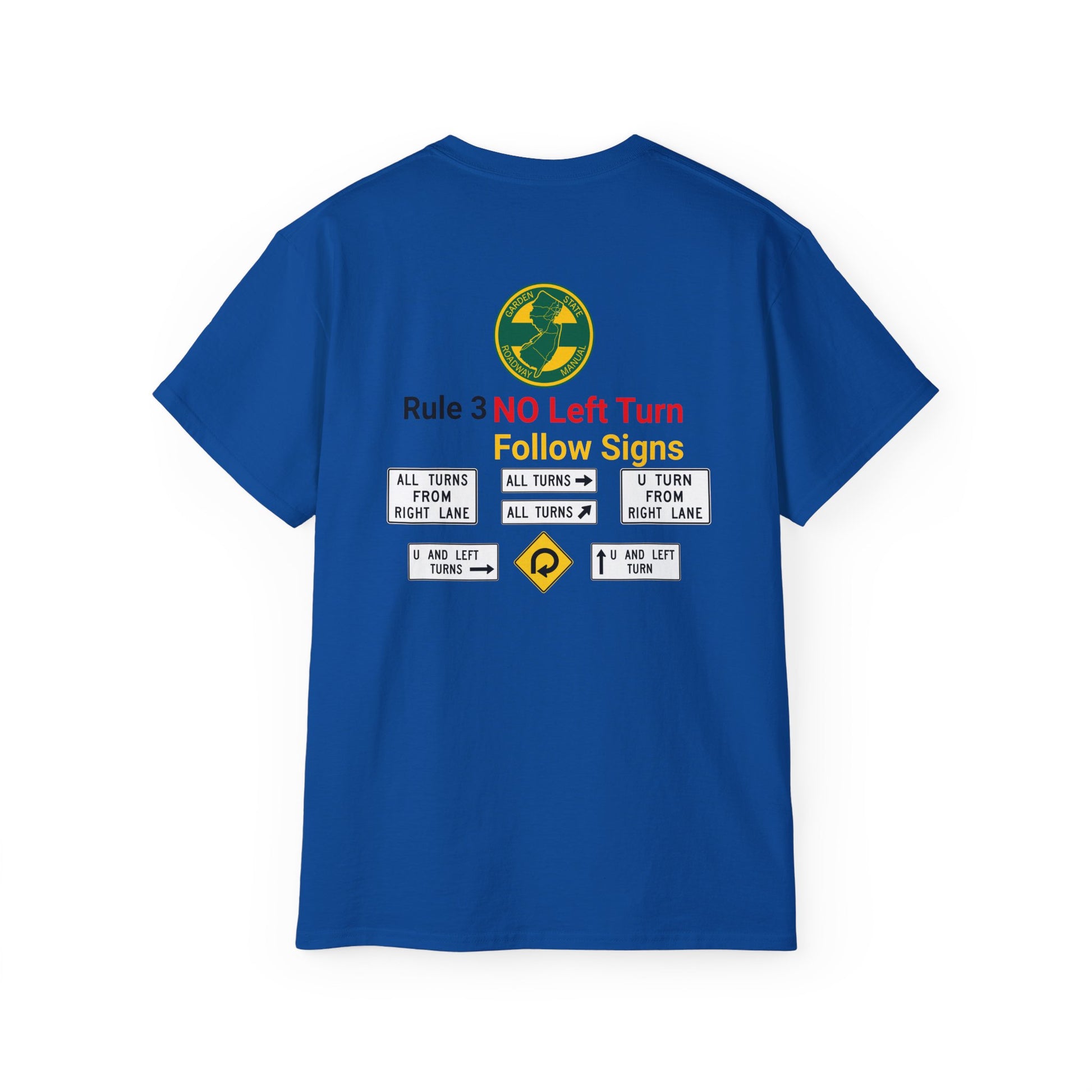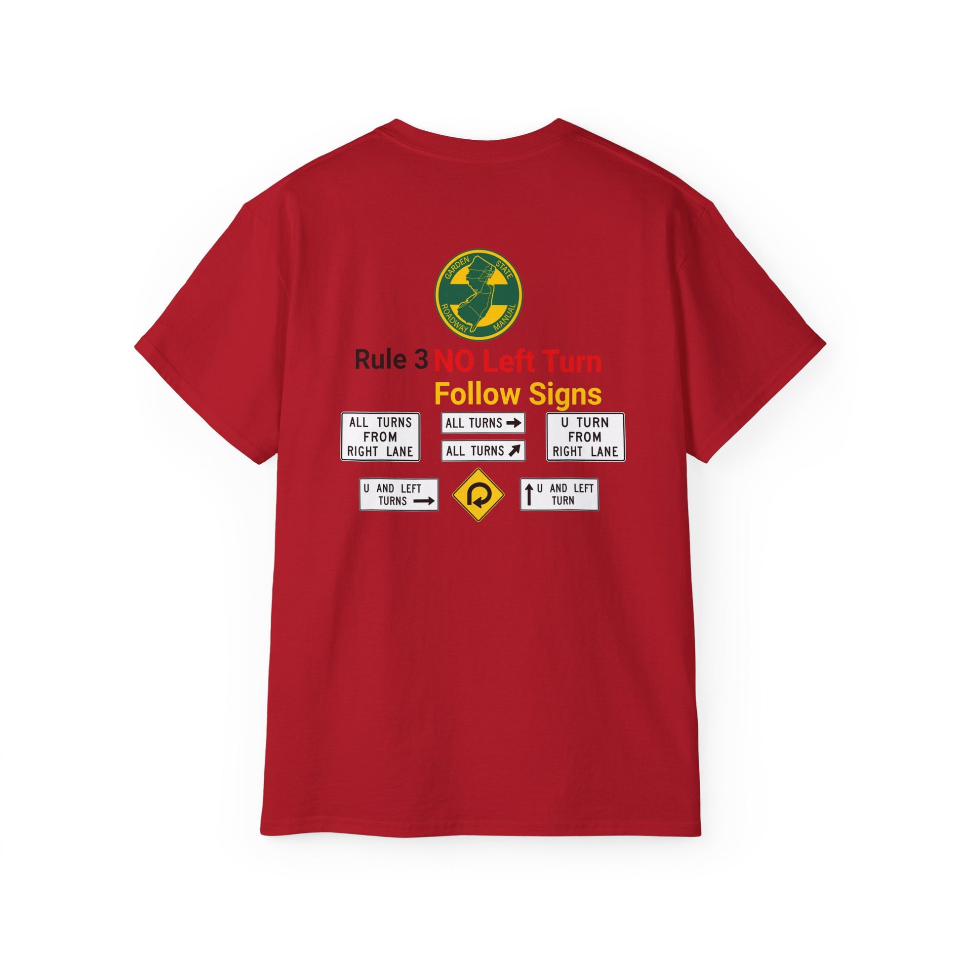 A snarky nod to New Jersey's unique driving atmosphere. Featuring the instantly recognizable yellow and green Garden State Parkway colors. Highlighting an atypical element of driving in New Jersey, the unmistakable "No Left Turn" which seem to exist at virtually every other intersection. A must-have for anyone who’s spent time on NJ’s roads.