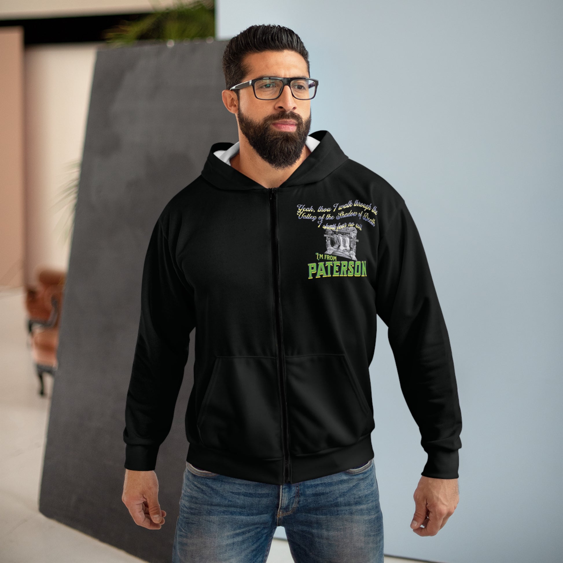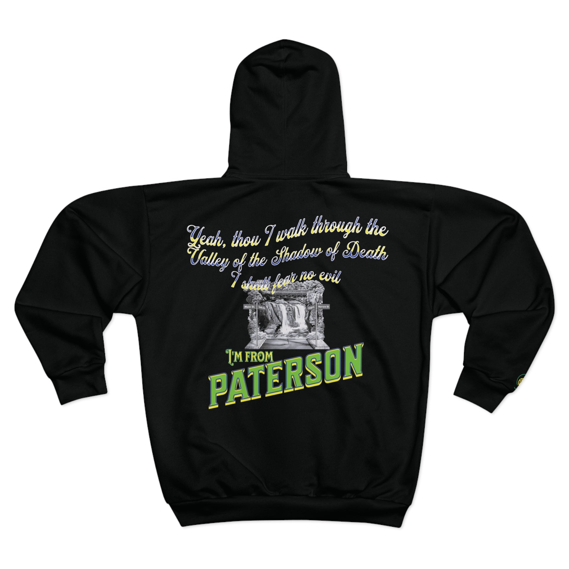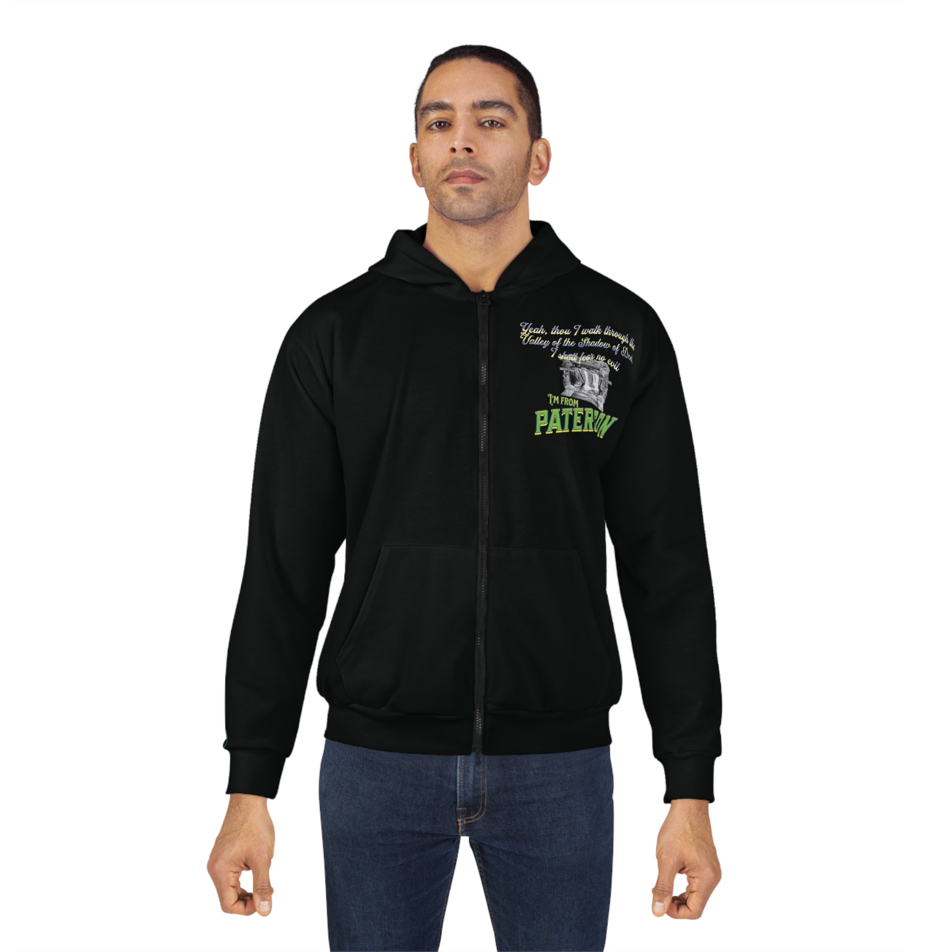 This hoodie celebrates the bold and fearless spirit of Paterson, N.J., making it a perfect match for those looking to showcase their unique spirit. With spacious pockets to keep hands warm and full decoration in bright colors, this 100% polyester hoodie is durable and stylish. The medium weight fabric and classic fit make it a comfortable and stylish addition to anyone's wardrobe, ideal for those who love Paterson or enjoy unique urban vibes.