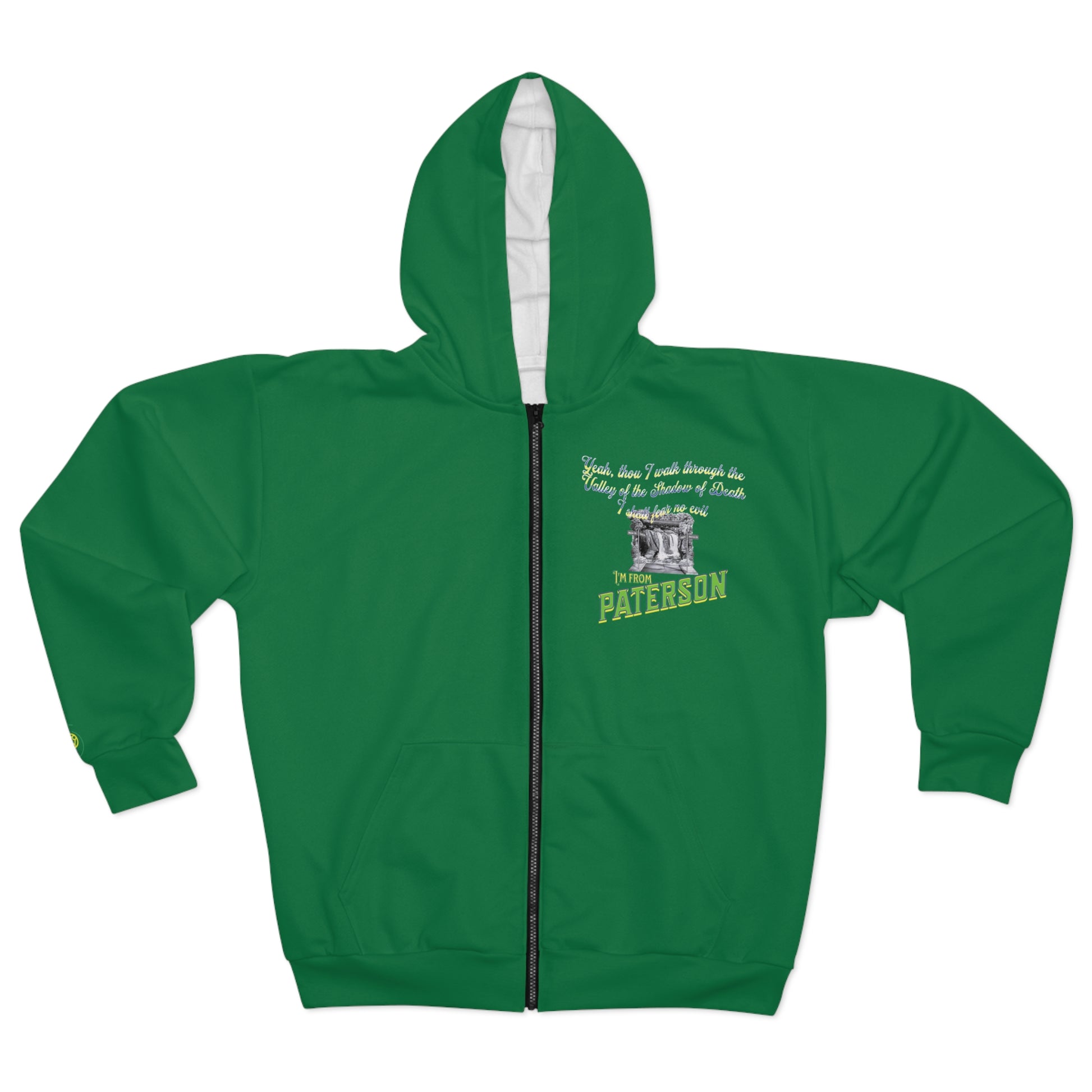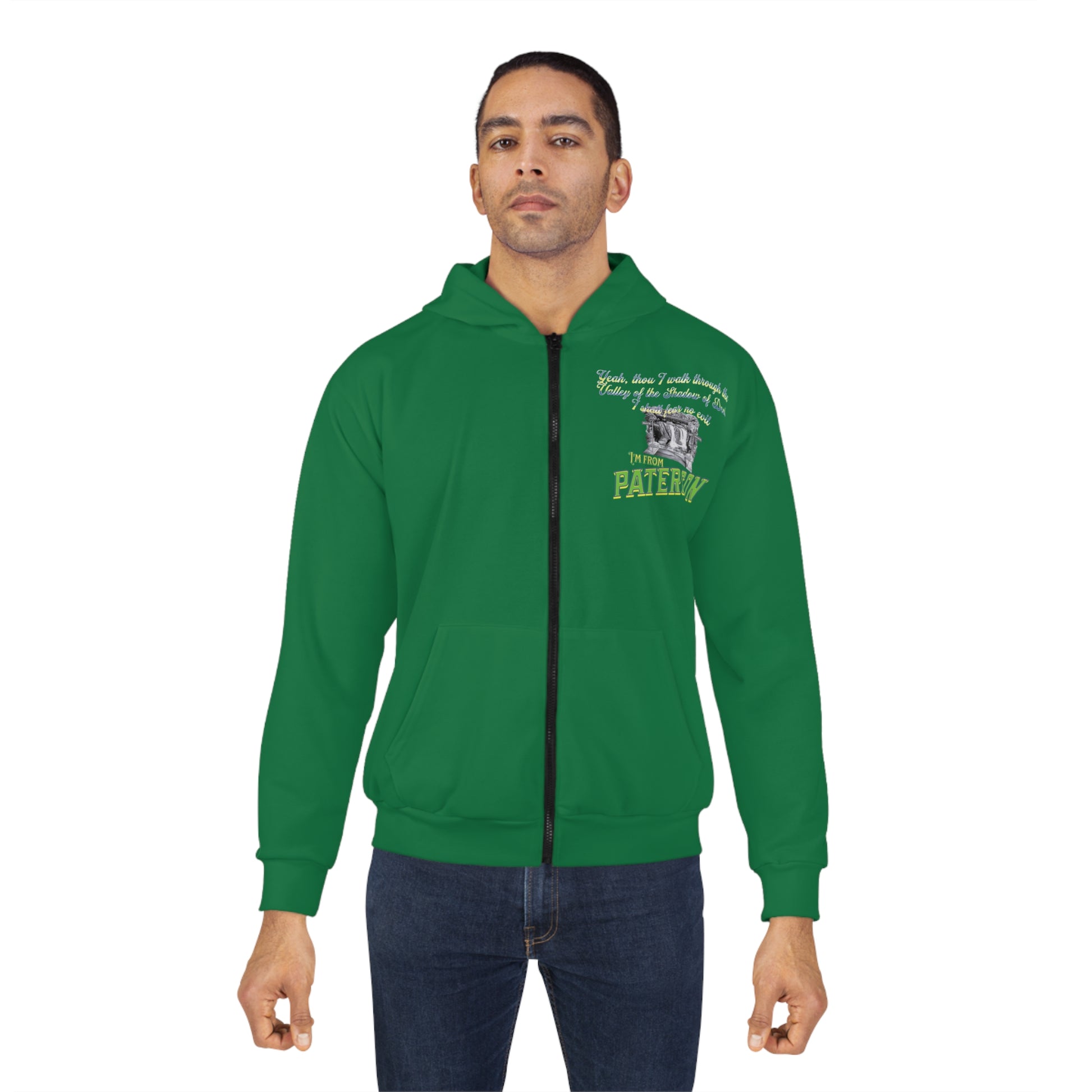 This hoodie celebrates the bold and fearless spirit of Paterson, N.J., making it a perfect match for those looking to showcase their unique spirit. With spacious pockets to keep hands warm and full decoration in bright colors, this 100% polyester hoodie is durable and stylish. The medium weight fabric and classic fit make it a comfortable and stylish addition to anyone's wardrobe, ideal for those who love Paterson or enjoy unique urban vibes.
