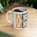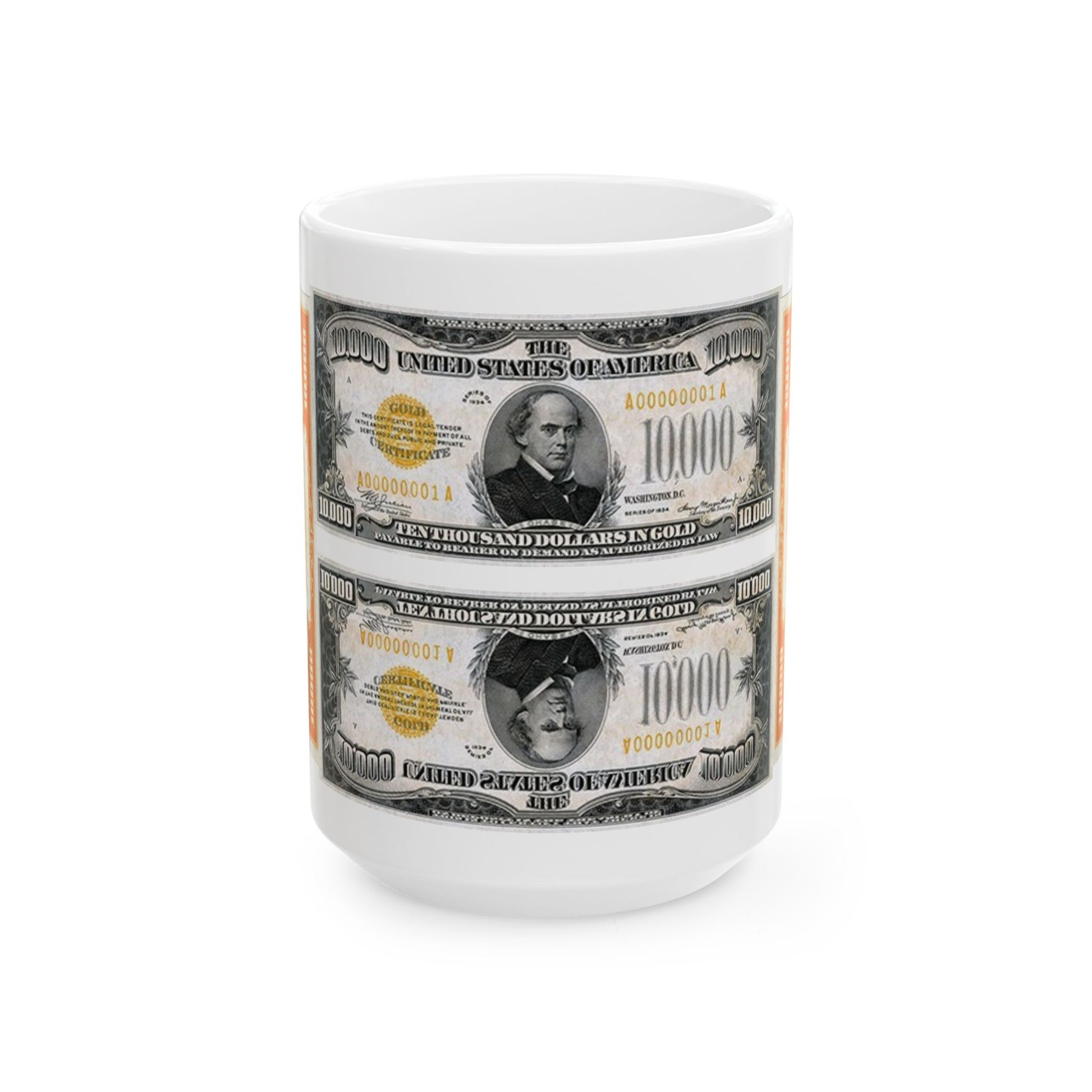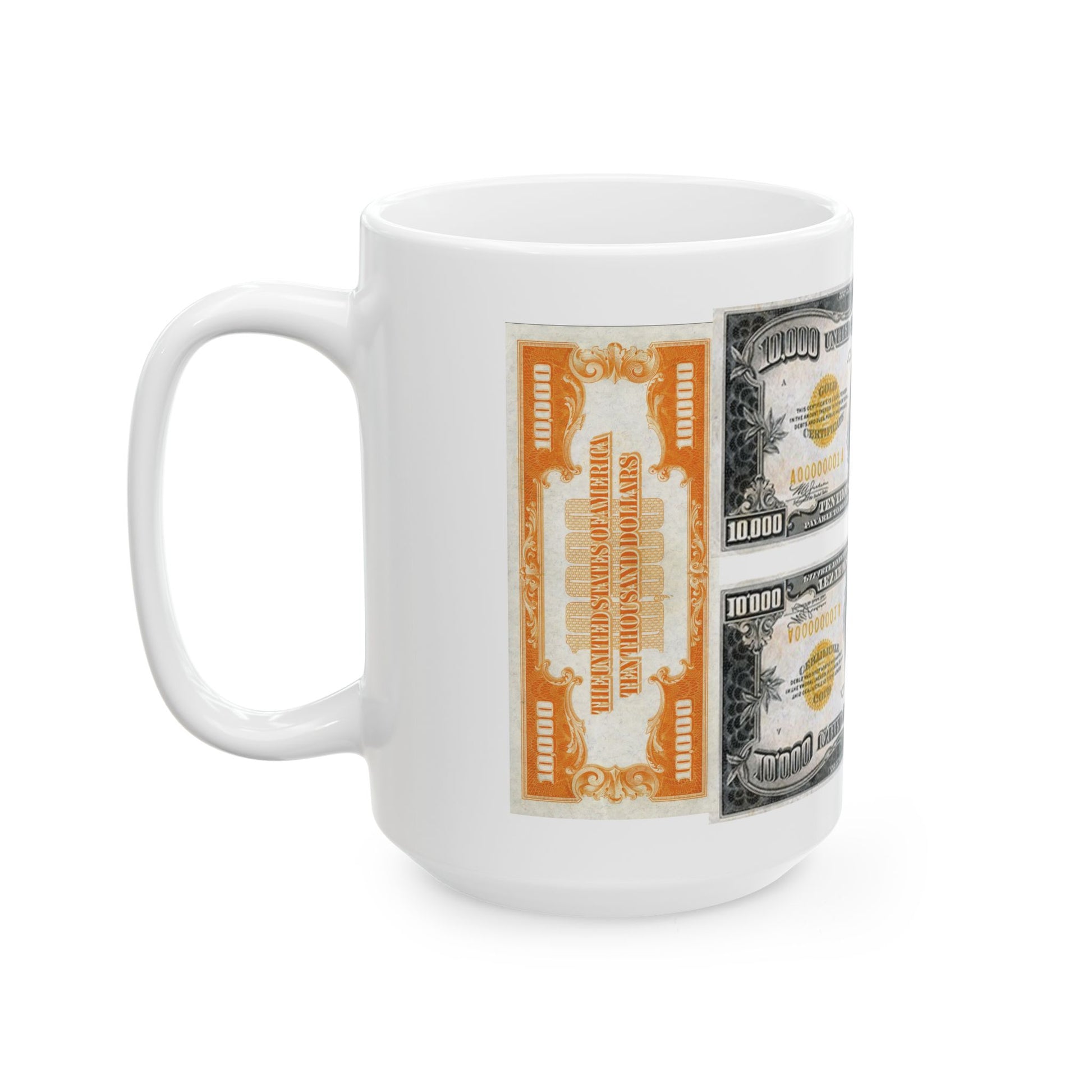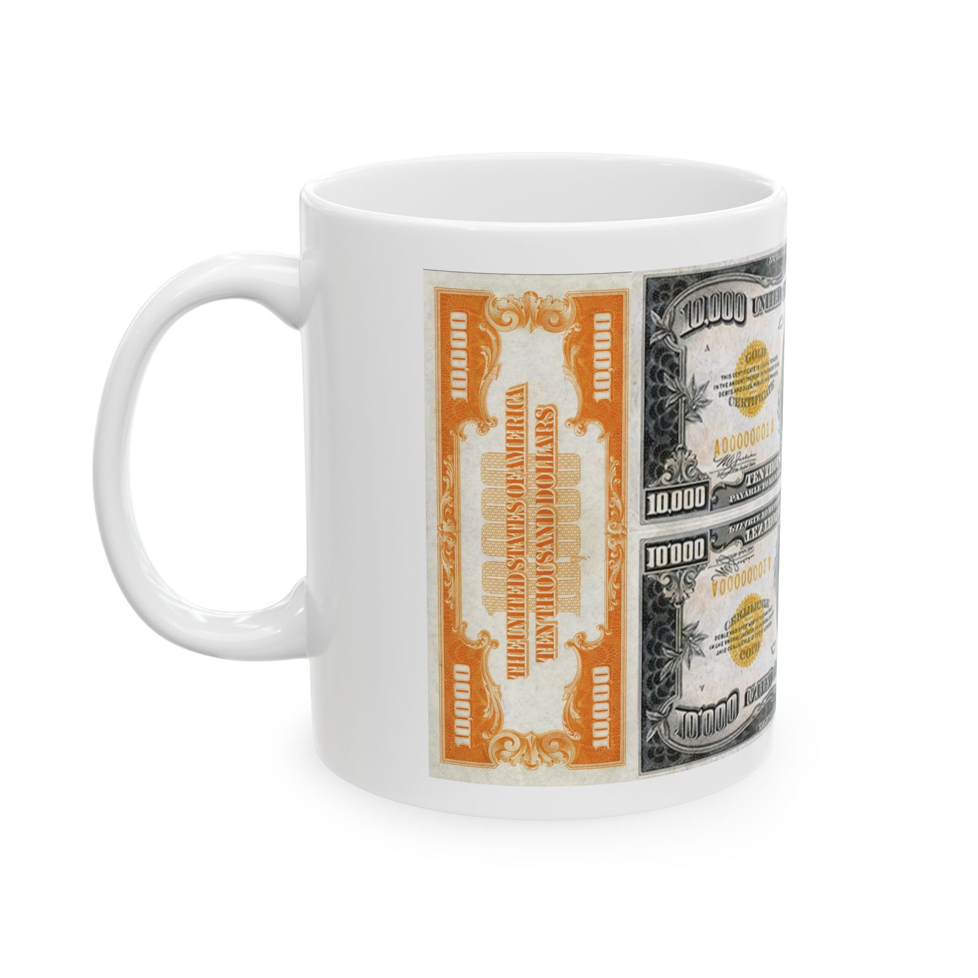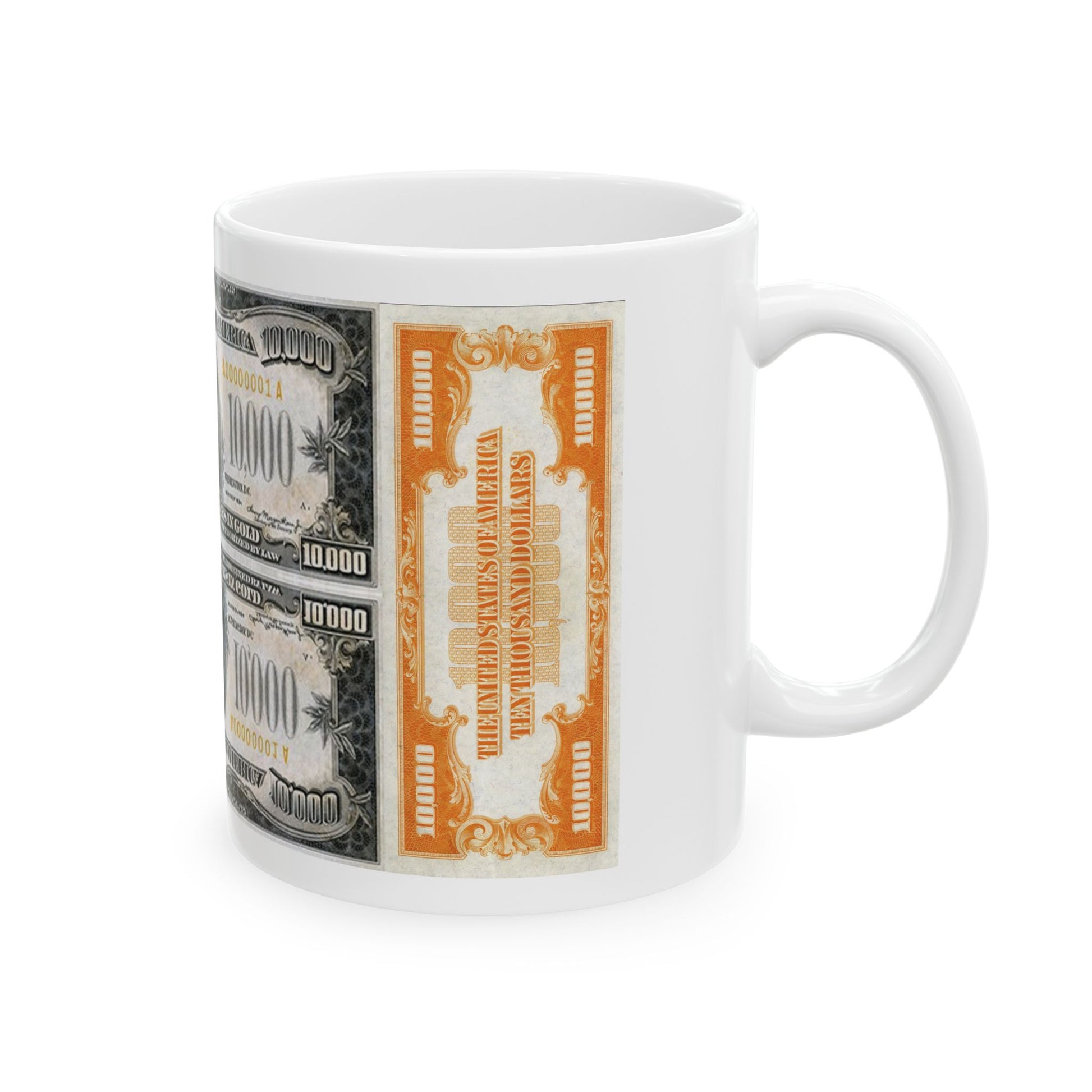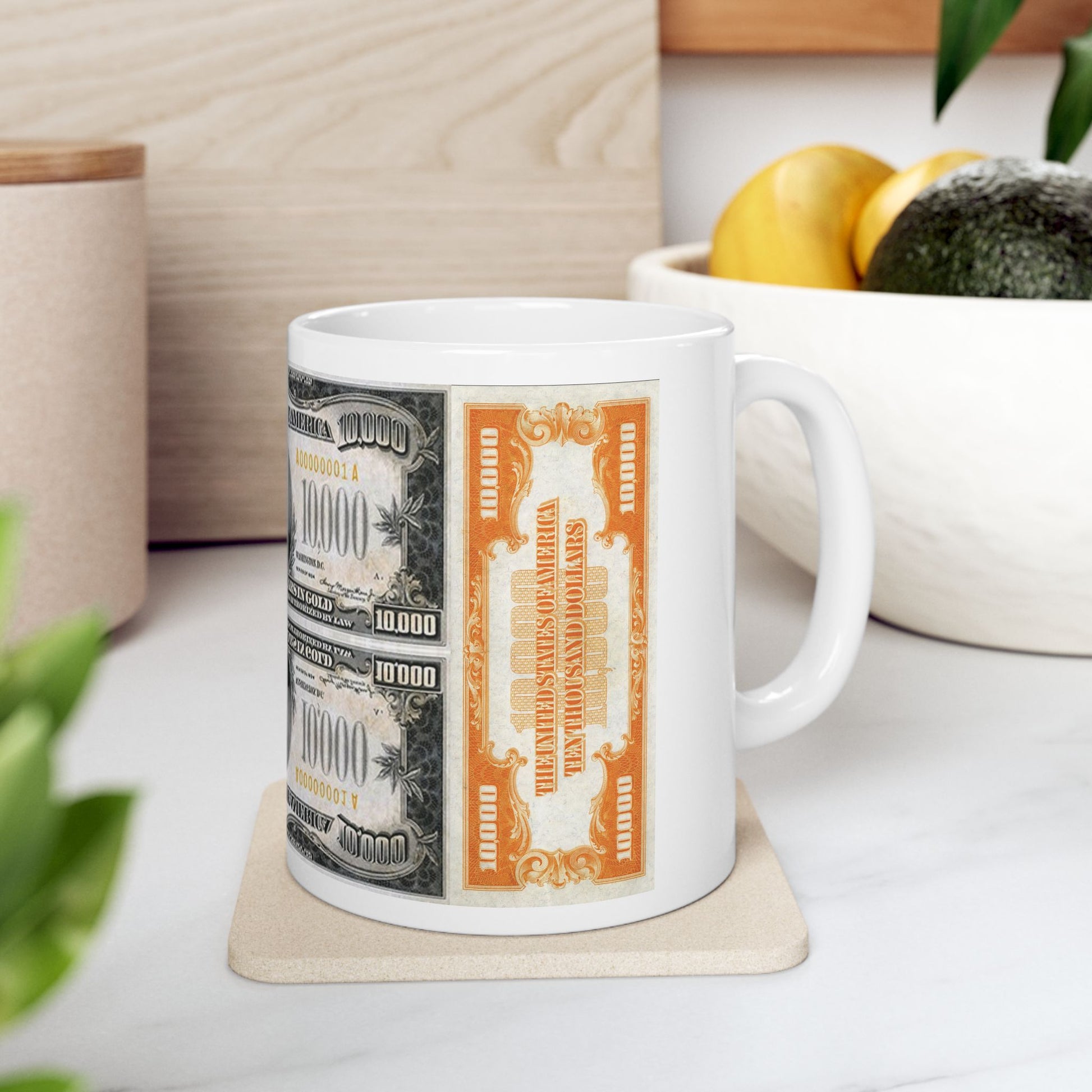 Warm-up with a nice cup of... out of this customized ceramic coffee mug. It features a striking design inspired by the rare and iconic $10,000 U.S. bill. Not in circulation since 1969, it was once used for high-value transactions The front and back of the note is beautifully printed on the surface of the mug, capturing the intricacy of its details of the currency. The images of the $10,000 bill makes this mug a unique collector's item, and adds a touch of historical significance and sophistication. Perfect for history enthusiasts or those who appreciate distinctive designs, this mug offers a conversation-starting piece that combines both style and a nod to American financial history. Whether you're sipping your morning coffee or displaying it as a collectible, this mug is sure to impress. Available in both 11 oz and 15 oz sizes, it is as functional as it is fascinating.